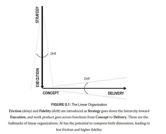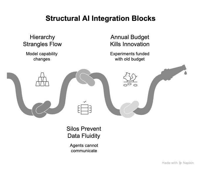 The hierarchy strangles flow. By the time a decision moves up three levels and back down, the model capability has already changed.